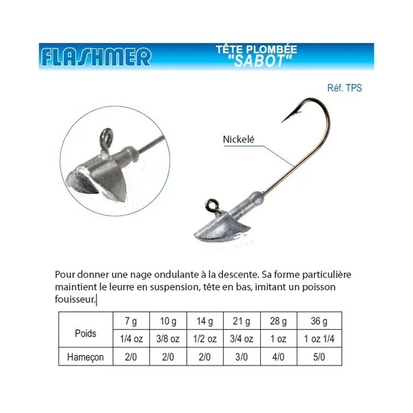 3 Têtes Plombées Sabot 10 gr Pour donner une nage ondulante à la descente. Sa forme particulière maintient le leurre en suspension, tête en bas, imitant un poisson fouisseur.