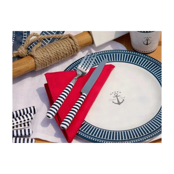 Assiette Plate Marine Business – Collection Sailor Soul – 6 Pièces La grande assiette plate en mélamine fait partie de la vaisselle en mélamine incassable Sailor Soul qui dispose de sets d’assiettes, mugs, saladier, tout fabriqué en mélamine, décorée avec un style nautique très élégant.