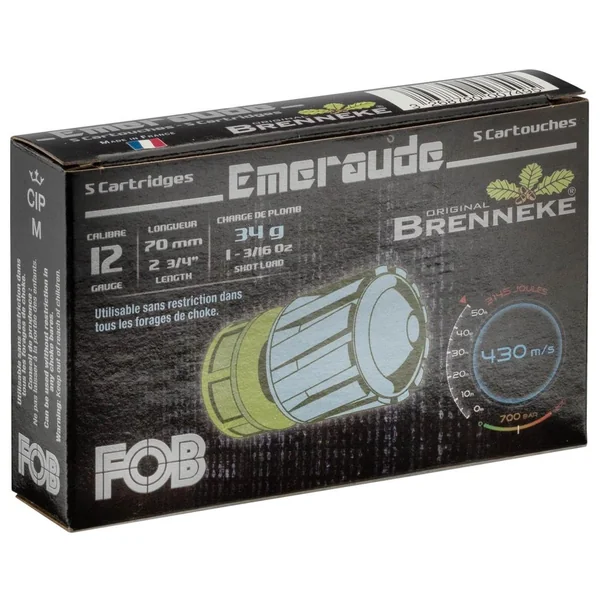 Les cartouches Brenneke Emeraude de FOB sont des balles pour fusil développant un grand pouvoir d’arrêt sur le grand gibier en mouvement. La vitesse des cartouches Emeraude a été mesurée à 430 m/s à la sortie du canon.