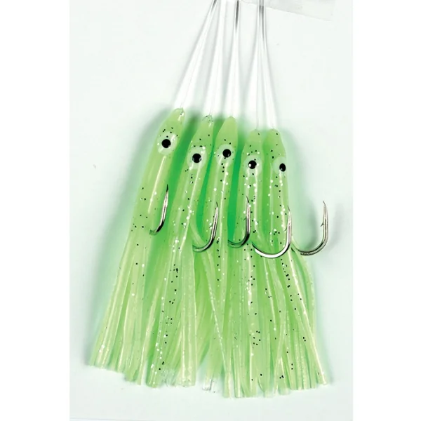 Bas de Ligne 5 Chipirons Flashmer 60 mm 2/0 Bas de Ligne 5 Chipirons 60 mm 2/0 pour pêcher en traine ou à la verticale bars, maquereaux, bonites etc.
