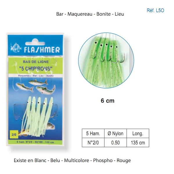 Longueur : 1350 mm Avis Bas de Ligne 5 Chipirons Flashmer 60 mm 2/0 Écrivez votre avis