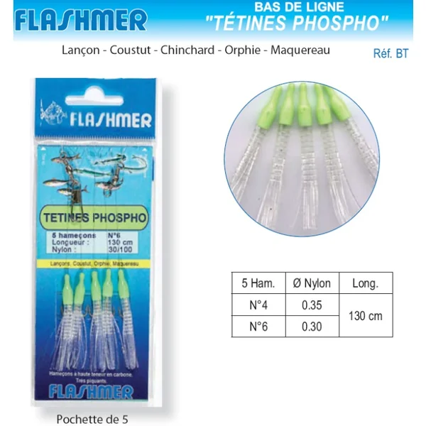 | Bas de ligne Tetines Phosphorescentes 5 Hameçons | Pochette de 5 N°4 > 0.35 > 1300 mm N°6 > 0.30 > 1300 mm |