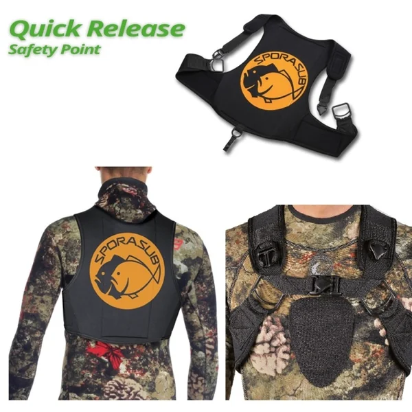 Baudrier Sporasub safety point – Ce nouveau Baudrier » safety » est caractérisé principalement par un système de largage rapide et un logo Sporasub orange pour une meilleure visibilité qui, une fois mis en place, permet de larguer ce gilet d’un simple geste.