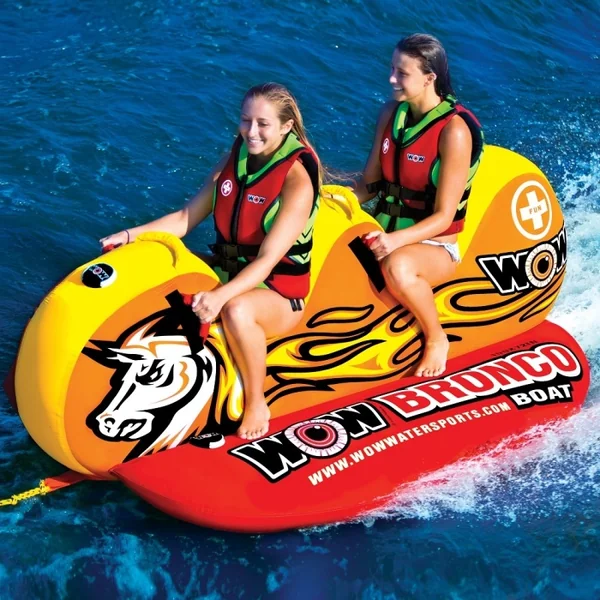 Bouée Tractée 2 personnes Wow Bronco Boat 2P Encore une fois, WOW s’est inspiré d’un ancien concept pour en crée un tout nouveau. Les bouées de type banane ou torpille existent depuis déjà de nombreuses années. Le Bronco Boat a été conçu avec le même profil mais propose en plus de deux sièges avec dossiers pour être bien en place lors de la glisse. Ce dossier permet également de séparer les riders en cas de chute. En plus, de larges boudins de chaque côté de la bouée permettent d’en améliorer l’équilibre et la stabilité. Le Bronco Boat est donc une super bouée tractée pour les enfants et toute la famille. Caractéristiques Bouée Tractée 2 personnes Wow Bronco Boat 2P