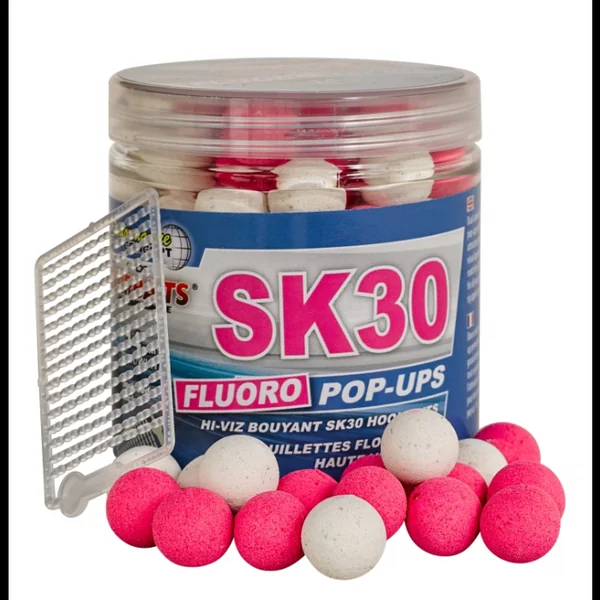 Bouillette Starbaits Performance Concept SK 30 Fluo Pop Up Formulée à partir de matières premières carnées de haute qualité reconnues pour leurs principes attractifs tels que: farines de poissons séchées à base température, extraits solubles de protéines de poissons, extraits marins, et associés à des composés attractifs solubles provenant du calamar ainsi que du krill, la « SK 30 » possède un profil en acides aminés ainsi qu’en acides gras permettant de la classer comme étant un appât indispensable dans la sélection de gros poissons sur un poste.