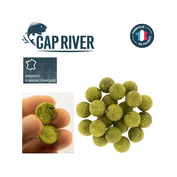 *Composition des bouillettes Banane Kiwi : Farine de maïs, Semoule de blé dur, Œuf entier en poudre, Farine de soja toasté, Robin Green Haith’s®, Aliment complémentaire d’allaitement pour veau, Farine de soja gras, Farine de LT94, Aliment complémentaire au fruit pour oiseaux, Farine de krill, Farine de levure de bière, Sel, Poudre de blanc d’œuf de volaille, Huile de saumon, Arôme Banane Kiwi Cap River.
