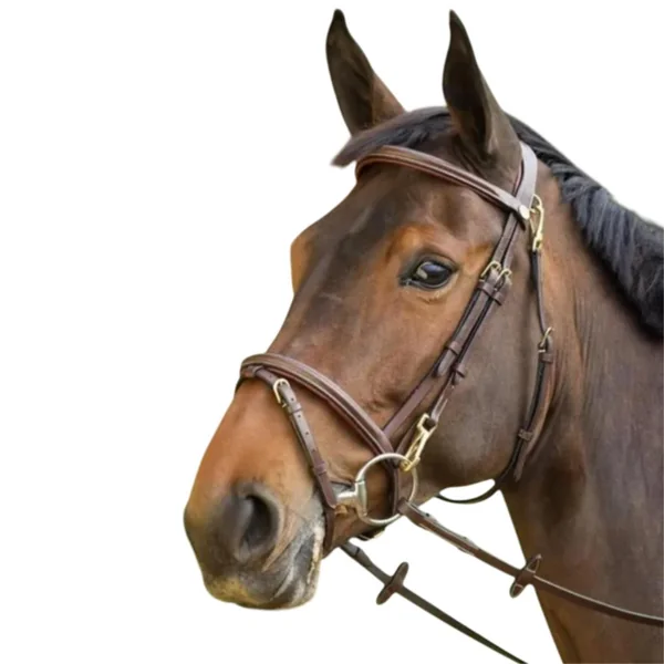 Ce bridon Fonctional de la marque HFI est à la fois confortable pour votre cheval au travail et pratique à utiliser pour vous. Créé dans du cuir de buffle solide, ce filet avec muserolle combinée est doté de mousquetons permettant de fermer les montants et la sous-gorge, de doublures souples et de surpiqures discrètes. Le bridon Functional en cuir HFI est idéal pour le travail quotidien du cheval ou les concours. Afin d’apporter plus de confort au cheval, la muserolle, la têtière et le frontal sont doublés d’une petite matelassure en cuir molle et le bridon a été conçu pour faire passer la lanière de la muserolle par-dessus la têtière afin de limiter la pression. Ce filet pour cheval se caractérise par des surpiqures couleur crème discrètes et chics, de petits bourrelets de cuir sur la muserolle et le frontal ainsi que par sa bouclerie couleur laiton, qui lui donnent une élégance tout en finesse. Livré avec une paire de rênes en cuir surmontées de caoutchouc pour une meilleure prise en main. La fermeture de la sous-gorge se fait par crochets pour plus de discrétion et de praticité. La muserolle montée sur ce filet permet une double utilisation : en retirant le noseband, vous pouvez l’utiliser en muserolle française simple. Avec le noseband, la muserolle combinée permet de limiter davantage l’ouverture de la bouche. Ce type de muserolle doit faire l’objet d’un réglage adéquat. Grâce aux fermetures mousquetons, il suffit d’un geste pour changer d’embouchure ou fermer la sous-gorge.