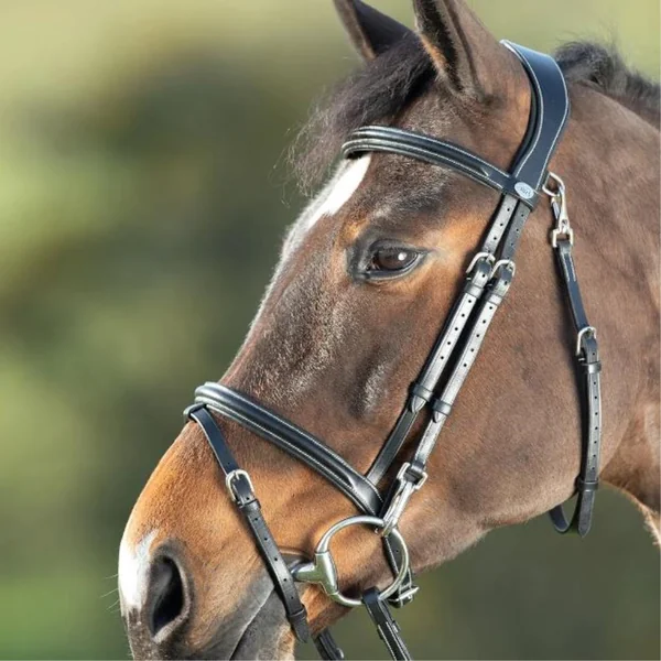 Le bridon cuir functional de la marque HFI est composé d’une large têtière anatomique, d’un frontal et d’une muserolle rembourrés et doublés de cuir souple. L’attache du mors et de la sous gorge se fait par mousquetons. Les surpiqures sont de couleur crème.