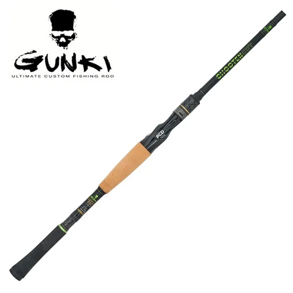 Modèle de canne de marque Gunki dont la sensibilité en pointe permet d’aborder la pêche des gros poissons avec des approches « fines» (shad et minnow en cranking, Spinnerbait & bladed jig en bordure…etc).