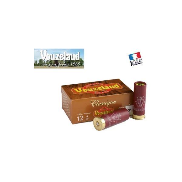 CARTOUCHES VOUZELAUD CLASSIC 32G PAR 10 : Caractéristiques : -CLASSIQUE Culot 8 mm, est à préférer pour ceux qui aiment la longueur 65 avec le numéro de plomb imprimé en bout et qui ne privilégient pas les grands coups de longueur.-Calibres : 12-Chambre : 65 mm-Poids de plombs (en g) : 32 g,-Hauteur du culot : 8 mm-Bourre VOUZELAUD à 2 éléments-Fermeture : Demi ronde Liège précoupé-N° de plombs disponible : 4, 5, 6, 7 & 8-Bourre : Jupe, -Boîte de 10 cartouches. *MUNITION SOUMISE A LA LEGISLATION : Carte d’identité + Permis de chasse OU Licence de tir valides OBLIGATOIRES. *AUCUNE LIVRAISON NE POURRA INTERVENIR SANS PIECES JUSTIFICATIVES.