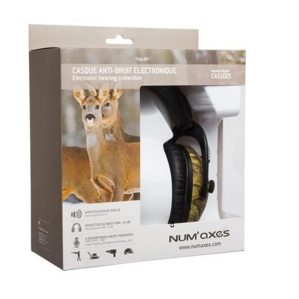 Le casque anti-bruit électronique Camouflage, de marque Num’axesatténue les bruits nuisibles, les détonations et amplifier considérablement les sons naturels extérieurs (personnes, animaux, feuillage…).