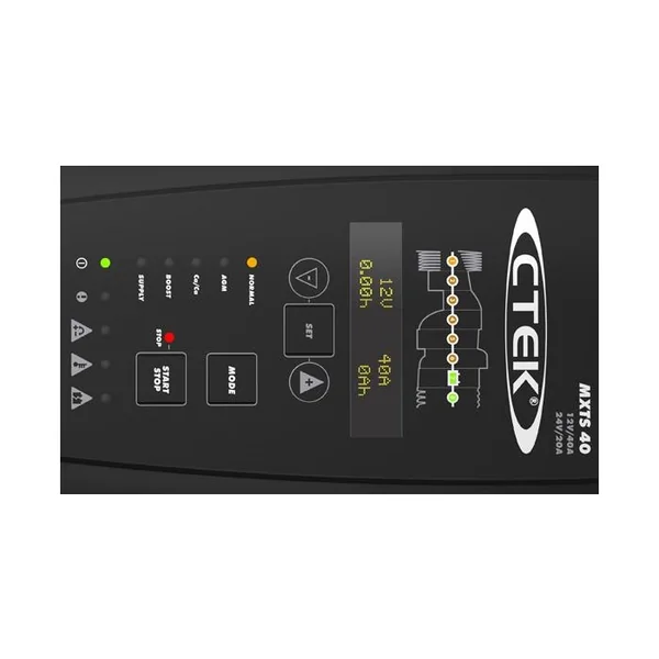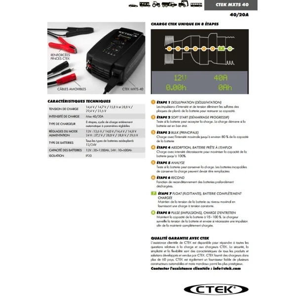 Chargeur de batterie Ctek MXTS 40 12-24 V Le MXTS 40 est le chargeur indispensable pour les utilisations en 12V et 24V. Simple à utiliser et totalement sécurisé, il est capable de recharger rapidement toutes les technologies de batteries au plomb.
