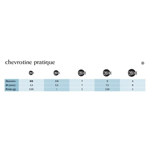 | Chevrotine pratique 1 kg | Vendu par 1 kg> N° BB > 0,50 g Vendu par 1 kg> N° 3/0 > 1 g Vendu par 1 kg> N° 7 > 2 g Vendu par 1 kg> N° 5 > 2,50 g Vendu par 1 kg> N° 4 > 3 g |