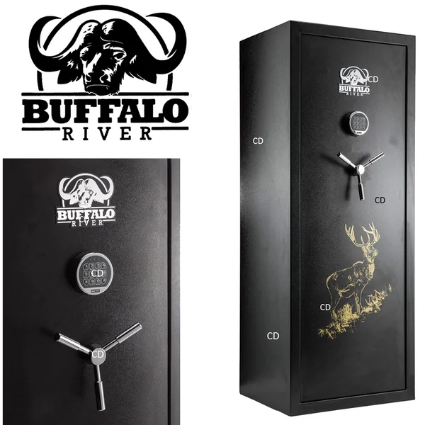 COFFRE BUFFALO DIGITAL PREMIUM 18 ARMES + COFFRE INTERIEUR :Caractéristiques :-Serrure électronique à combinaison avec clef de secours. (Nécessite de démonter le boitier électronique)-Porte épaisse avec verrouillage par tenons multiples actionnés par une poignée unique.-Intérieur des coffres tapissés de moquette grise.-Tous nos coffres sont livrés avec un jeu de chevilles à béton de fixation, 2 clefs coffres à munitions, 2 clefs de secours porte principal et un jeu de piles.-8 points de fermeture.-5 pênes mobiles et 3 fixes.-Ouverture avec poignée.-Revêtement intérieur gris.-Epaisseur porte : 5mm.-Epaisseur parois : 2mm.-Hauteur intérieure utile maxi / mini : 1480/1260mm.-Poids : 100Kg.*Dimensions extérieures : Hauteur de 150cm, largeur de 58,5cm et profondeur de 46cm.-Epaisseur : 2mm.*Dans le cadre de la détention d’armes de catégorie B, il est obligatoire de posséder un coffre pour maintenir les armes en question hors de portée des tierces personnes. D’une façon générale, il est fortement conseillé de mettre ses armes, quelques soient leurs catégories (B, C ou D) hors de portée des enfants et d’éventuels intrus ou voleurs en les stockant à l’abri dans un coffre pour armes. Ce coffre doit impérativement être fixé au sol ou au mur.