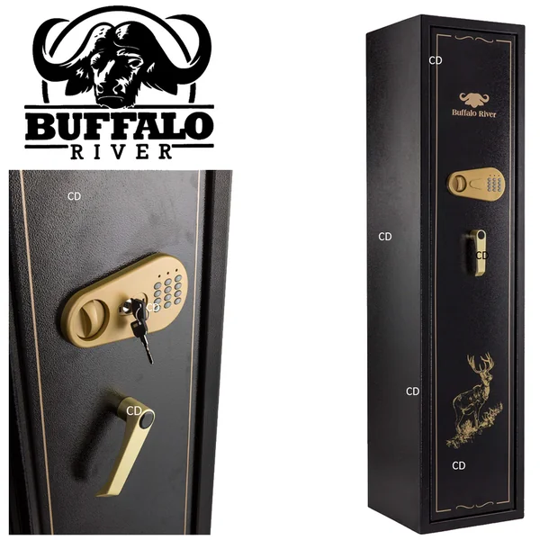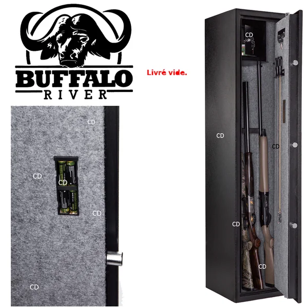 COFFRE BUFFALO DIGITAL PREMIUM 7 ARMES + COFFRE INTERIEUR :Caractéristiques :-Serrure électronique à combinaison avec clef de secours. (Nécessite de démonter le boitier électronique)-Porte épaisse avec verrouillage par tenons multiples actionnés par une poignée unique.-Intérieur des coffres tapissés de moquette grise.-Tous nos coffres sont livrés avec un jeu de chevilles à béton de fixation, 2 clefs coffres à munitions, 2 clefs de secours porte principal et un jeu de piles.-8 points de fermeture.-5 pênes mobiles et 3 fixes.-Ouverture avec poignée.-Revêtement intérieur gris.-Epaisseur porte : 3mm.-Epaisseur parois : 2mm.-Hauteur intérieure utile maxi / mini : 1480/1260mm.-Poids : 62Kg.*Dimensions extérieures : Hauteur de 150cm, largeur de 36cm et profondeur de 36cm.-Epaisseur : 2mm.*Dans le cadre de la détention d’armes de catégorie B, il est obligatoire de posséder un coffre pour maintenir les armes en question hors de portée des tierces personnes. D’une façon générale, il est fortement conseillé de mettre ses armes, quelques soient leurs catégories (B, C ou D) hors de portée des enfants et d’éventuels intrus ou voleurs en les stockant à l’abri dans un coffre pour armes. Ce coffre doit impérativement être fixé au sol ou au mur.