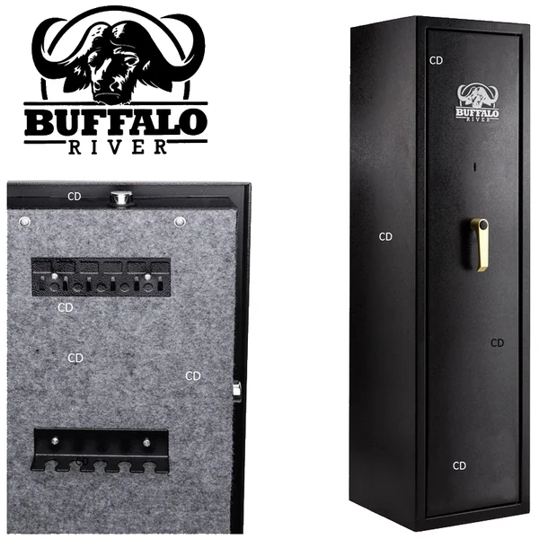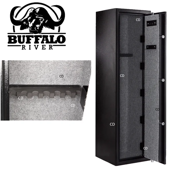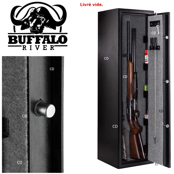 COFFRE BUFFALO PREMIUM A CLEF 7 ARMES 130CM :Caractéristiques :-Coffre-fort pour 7 armes, avec ouverture centralisée sur 1 clef et 1 poignée, de marque Buffalo River.-Serrure à clef unique avec poignée actionnant les tenons multiples.-Porte épaisse.-Intérieur des coffres tapissés de moquette grise.-Tous nos coffres sont livrés avec un jeu de chevilles à béton de fixation, 2 clefs coffres à munitions et 2 clefs principales.-Finition suivant arrivage : porte de coffre avec sérigraphie dorée logo Buffalo river et cerf ou avec logo Buffalo river métallisé autocollant uniquement.-8 points de fermeture.-5 pênes mobiles et 3 fixes.-Ouverture avec poignée.-Epaisseur porte : 3mm.-Epaisseur parois : 2mm.-Serrure unique.-Hauteur intérieure utile: 1280mm.-Poids : 48Kg.*Dimensions extérieures : Hauteur de 130cm, largeur de 36cm et profondeur de 36cm.-Epaisseur : 2mm.*Dans le cadre de la détention d’armes de catégorie B, il est obligatoire de posséder un coffre pour maintenir les armes en question hors de portée des tierces personnes. D’une façon générale, il est fortement conseillé de mettre ses armes, quelques soient leurs catégories (B, C ou D) hors de portée des enfants et d’éventuels intrus ou voleurs en les stockant à l’abri dans un coffre pour armes. Ce coffre doit impérativement être fixé au sol ou au mur.