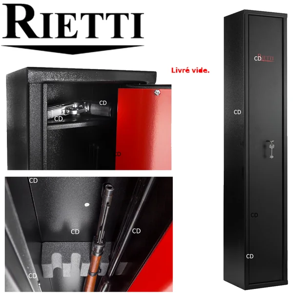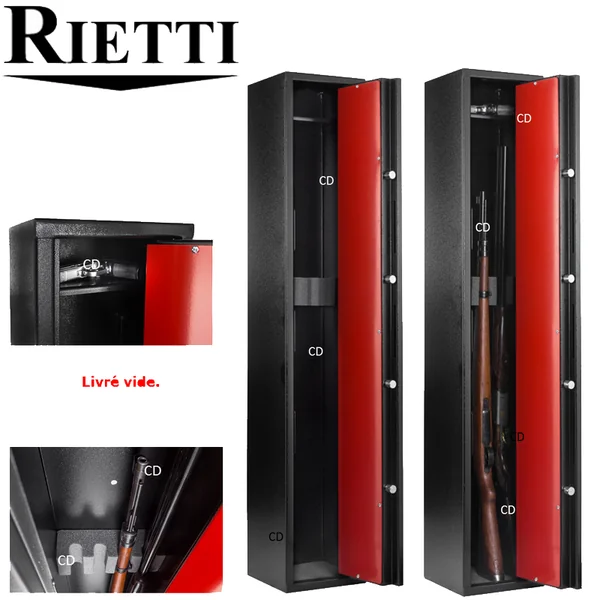 Coffre-fort, de marque Rietti, pour 4 armes longues, avec ouverture centralisée sur clef.Fabrication européenne.Serrure à clef unique avec poignée actionnant les tenons multiples.Porte épaisse.Intérieur du coffre noir.Intérieur de la porte en tôle laquée rouge.*Dimensions utiles grand compartiment : Hauteur de 127cm, Profondeur de 19cm et Largeur de 24cm.Petite tablette pour armes ou objets de valeur, de dimensions utiles de : Hauteur de 10cm, Profondeur de 16cm et Largeur de 24cm. (non refermable) Râtelier en mousse, pour 4 fusils dans le fond du coffre.Tous nos coffres sont livrés avec un jeu de chevilles à béton de fixation et 2 clefs principales.Quatre pênes mobiles.Ouverture directe avec la clef.Epaisseur porte : 2mm.Epaisseur parois : 2mm.Serrure unique.Poids : 33Kg.*Dimensions extérieures : Hauteur de 140cm, largeur de 25cm et profondeur de 25cm.*Dans le cadre de la détention d’armes de catégorie B, il est obligatoire de posséder un coffre pour maintenir les armes en question hors de portée des tierces personnes. D’une façon générale, il est fortement conseillé de mettre ses armes, quelques soient leurs catégories (B, C ou D) hors de portée des enfants et d’éventuels intrus ou voleurs en les stockant à l’abri dans un coffre pour armes. Ce coffre doit impérativement être fixé au sol ou au mur.