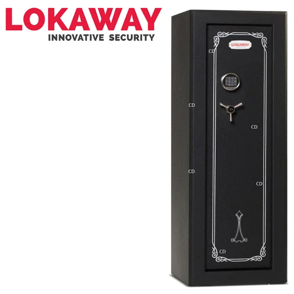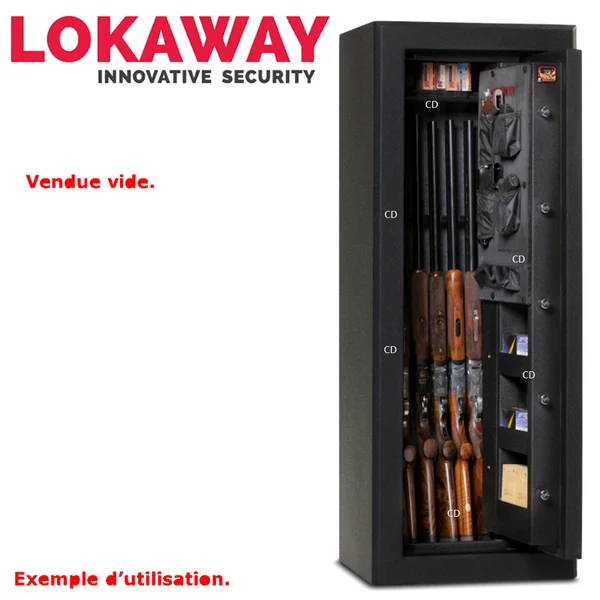 *Garantie 10 ans. (sauf partie électronique=2 ans)Coffre anti-feu 30 minutes à 648°C (double paroi)Conception de fermeture innovante, dissimulation des charnières, cylindres de sécurité en très grand nombre, les coffres Lokaway regroupent ces éléments simples pour faire un coffre d’une sécurité inédite. Coffre-fort Excutive, pour 10 armes, de marque Lokaway.Equipé du système unique anti-effraction Swing’nSlide.*Voir la vidéo ! -Fermeture Digicode avec clef de sécurité fournie.-14 cylindres de 32mm.-Poignée de porte Design.-Feutrine intérieure grise.-Multiples emplacements de porte.-Etagères et râtelier modulables.-Epaisseur du corps du coffre : 4mm.-Epaisseur de la porte du coffre : 4mm.*Dimensions extérieures : 150 x 46 x 51cm.*Dimensions intérieures : 148 x 45 x 48cm. -Poids : 150Kg.*A savoir sur le système Lokaway Swing’n’Slide anti-effraction :-Le système Swing’n’Slide de Lokaway, système le plus révolutionnaire de ces dernières années, breveté dans plus de 30 pays sur 6 continents, arrive aujourd’hui en France !-Unique en son genre, développé suite à des années de test et une expérience en sécurité engrangé au fur et à mesure du temps, nous pouvons dire aujourd’hui que ce système est le plus sûr en matière de sécurité anti-effraction.-La dissimulation complète des bords de porte empêche tout point d’ancrage de quelques outils qu’ils soient et rend le coffre Lokaway complètement inviolable.