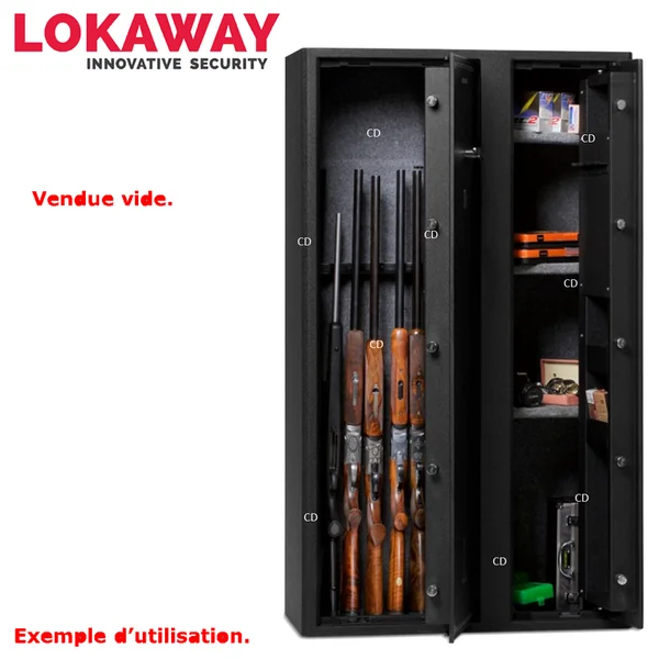 *Garantie 10 ans. (sauf partie électronique=2 ans)Conception de fermeture innovante, dissimulation des charnières, cylindres de sécurité en très grand nombre, les coffres Lokaway regroupent ces éléments simples pour faire un coffre d’une sécurité inédite. Coffre-fort, série LOK, pour 24 armes, de marque Lokaway.Modèle double porte indépendantes. Equipé du système unique anti-effraction Swing’nSlide.*Voir la vidéo ! -Fermeture par clef et poignée en métal. -5 cylindres de 25mm et 6 grips acier. -Poignée de porte en métal.-Feutrine intérieure grise.-Multiples emplacements de porte.-Epaisseur du corps du coffre : 2mm.-Epaisseur de la porte du coffre : 2mm.*Dimensions extérieures : 150 x 86 x 40cm.*Dimensions intérieures : 148 x 84 x 37cm. -Poids : 112Kg.*A savoir sur le système Lokaway Swing’n’Slide anti-effraction :-Le système Swing’n’Slide de Lokaway, système le plus révolutionnaire de ces dernières années, breveté dans plus de 30 pays sur 6 continents, arrive aujourd’hui en France !-Unique en son genre, développé suite à des années de test et une expérience en sécurité engrangé au fur et à mesure du temps, nous pouvons dire aujourd’hui que ce système est le plus sûr en matière de sécurité anti-effraction.-La dissimulation complète des bords de porte empêche tout point d’ancrage de quelques outils qu’ils soient et rend le coffre Lokaway complètement inviolable.