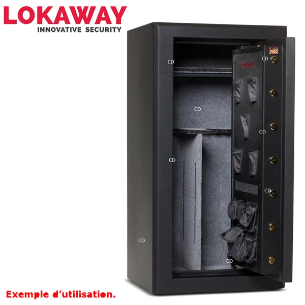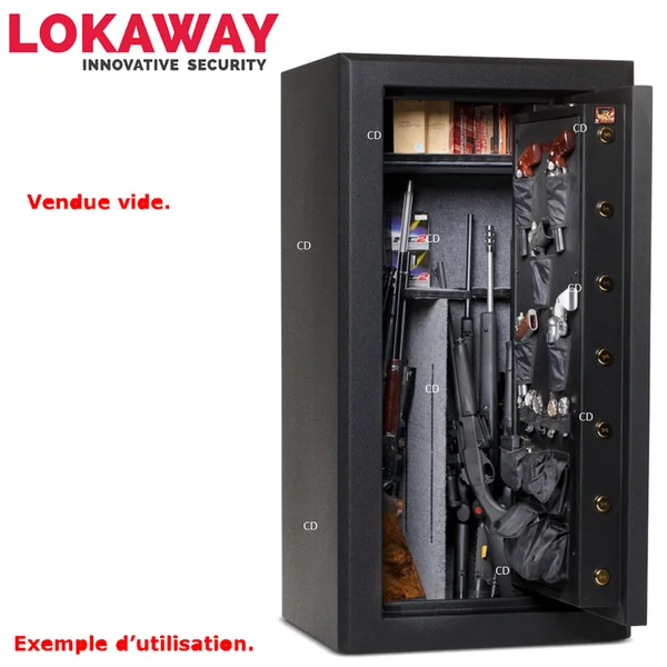 *Garantie 10 ans. (sauf partie électronique=2 ans)Coffre anti-feu 60 à 75 minutes à 742°C (double paroi)Conception de fermeture innovante, dissimulation des charnières, cylindres de sécurité en très grand nombre, les coffres Lokaway regroupent ces éléments simples pour faire un coffre d’une sécurité inédite. Coffre-fort Premium, pour 26 armes, de marque Lokaway.Equipé du système unique anti-effraction Swing’nSlide.*Voir la vidéo ! -Fermeture Digicode avec clef de sécurité fournie.-12 cylindres de 38mm.-Poignée de porte Design.-Feutrine intérieure grise.-Multiples emplacements de porte.-Epaisseur du corps du coffre : 6mm.-Epaisseur de la porte du coffre : 6mm.*Dimensions extérieures : 150 x 79 x 65cm.*Dimensions intérieures : 148 x 78 x 62cm. -Poids : 305Kg.*A savoir sur le système Lokaway Swing’n’Slide anti-effraction :-Le système Swing’n’Slide de Lokaway, système le plus révolutionnaire de ces dernières années, breveté dans plus de 30 pays sur 6 continents, arrive aujourd’hui en France !-Unique en son genre, développé suite à des années de test et une expérience en sécurité engrangé au fur et à mesure du temps, nous pouvons dire aujourd’hui que ce système est le plus sûr en matière de sécurité anti-effraction.-La dissimulation complète des bords de porte empêche tout point d’ancrage de quelques outils qu’ils soient et rend le coffre Lokaway complètement inviolable.