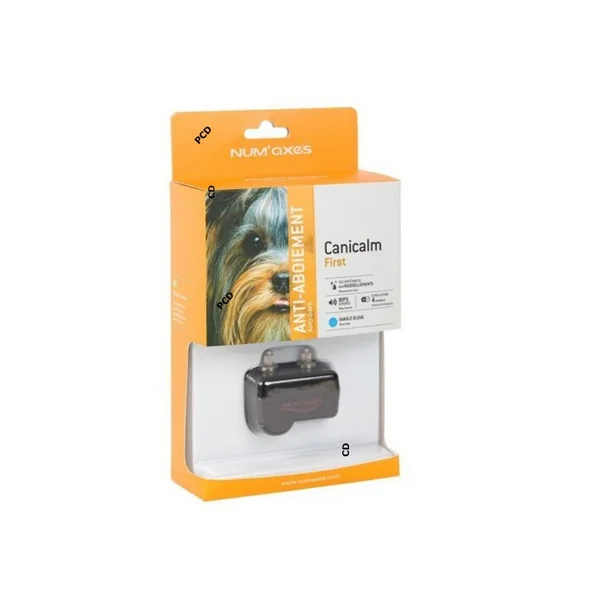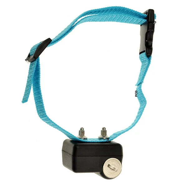 -1 collier anti-aboiement CANICALM First équipé d’électrodes courtes et d’une sangle nylon bleue.