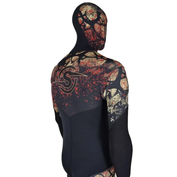 Le motif extérieur du néoprène est innovant et combine les caractéristiques du camouflage coloré avec celles du camouflage par décomposition de l’image, pour obtenir un effet de dissimulation maximal face aux poissons.