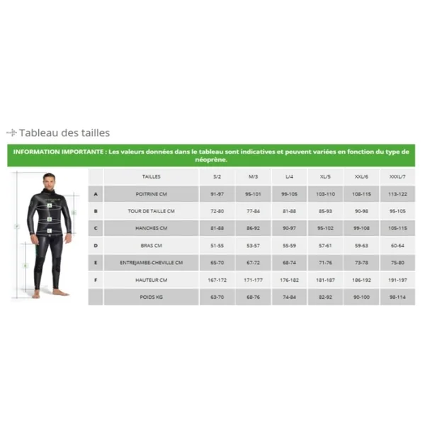 – Le néoprène utilisé garantit un grand confort grâce à son excellente élasticité. Le néoprène sélectionné a une très bonne résistance à l’écrasement en grande profondeur. La veste est dotée d’un renfort d’armement, de renforts aux coudes et d’un empiècement spécial au niveau des oreilles pour éviter le phénomène d’aspiration.