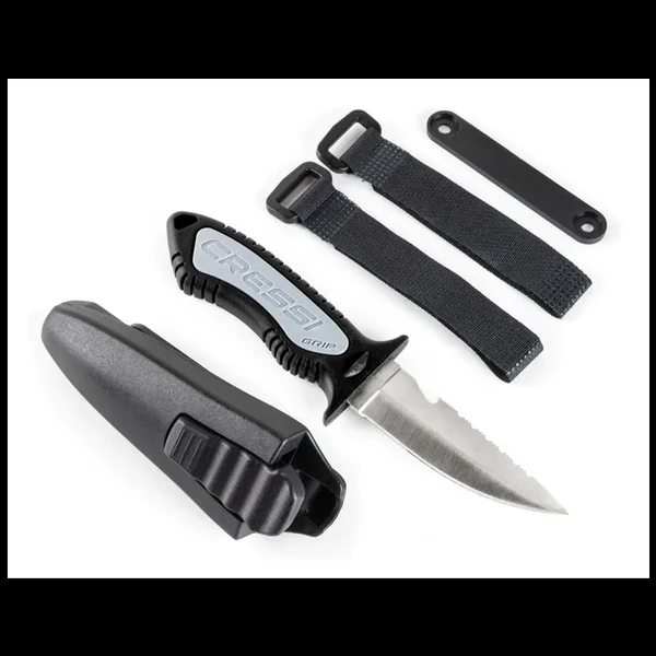 Couteau Cressi Grip Le grip spear est un couteau de petite taille avec une lame effilée qui le rend idéal pou r la chasse sous-marine. La lame est en inox. Il dispose d’une pointe de forme dague de haute précision. D’un côté une lame crantée extra-rigide pour scier, de l’autre côté une lame lisse habilement façonnée.