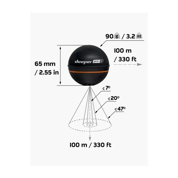 La fonction double fréquence de Deeper PRO+ permet une excellente observation sous l’eau, quelles que soient les profondeurs, dans un rayon de 90 kHz (55°) et 290 kHz (15°). Le faisceau large permet d’avoir une surface plus grande de recherche de poissons, appâts et structure. Le faisceau étroit et précis donne des rendements d’une haute précision de poissons, structure, détail et profil du fond. Avec Deeper PRO+, vous pouvez ratisser large ou vous concentrer sur le fond.