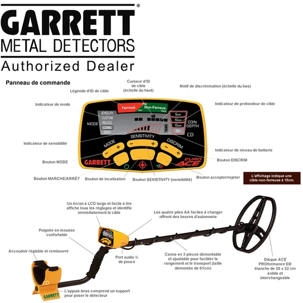DETECTEUR DE METAUX GARRETT EURO ACE : Caractéristiques :-Garrett, la marque de référence dans le milieu de la détection.-Caractéristiques identiques au ACE 250, mais livré avec un casque avec réglage du volume Garrett «clearsound», le sac à dos Garrett et la housse pluie.-De plus, l’EURO ACE est équipé d’un disque 22 x 28cm DD permettant une détection plus fine.-Le must de la détection.*Caractéristiques techniques :-Identification graphique, affichage de la profondeur.-Sensibilité réglable sur 8 niveaux.-Notch, pinpoint, identification sonore multi-tons.-5 modes de recherche.-Canne démontable en 3 parties sans bague de serrage.-Prise pour casque, fréquence : 8.5 kHz.-Autonomie : 20 heures.-Piles inclues: 4 x AA 1,5 volts.-Livré avec casque réglage du volume, protection pluie, sac à dos.-Niveau de prise en main : Très aisé.-Technologie : VLF.-Ecran : LCD noir et blanc.-Technologie du disque d’origine : DD / Wide scan.-Discrimination / Rejet des métaux : Par plage de métaux (fer, alu,zinc…).-Notch : Oui.-Pinpoint : Visuel et Sonore.-Nombre de tons : 3.-Compensation effet de sol : Préréglée.-Décalage de fréquence non.-Volume sonore : Non réglable.-Volume Fer : non réglable.-Réactivité : Non réglable.-Degré d’étanchéité : Disque étanche uniquement.-Poids : 1kg300.*Prix de vente conseillée 2018 : 515€. Normal 0 21 false false false FR X-NONE X-NONE /* Style Definitions */ table.MsoNormalTable {mso-style-name: »Tableau Normal »; mso-tstyle-rowband-size:0; mso-tstyle-colband-size:0; mso-style-noshow:yes; mso-style-priority:99; mso-style-parent: » »; mso-padding-alt:0cm 5.4pt 0cm 5.4pt; mso-para-margin-top:0cm; mso-para-margin-right:0cm; mso-para-margin-bottom:10.0pt; mso-para-margin-left:0cm; line-height:115%; mso-pagination:widow-orphan; font-size:11.0pt; font-family: »Calibri », »sans-serif »; mso-ascii-font-family:Calibri; mso-ascii-theme-font:minor-latin; mso-hansi-font-family:Calibri; mso-hansi-theme-font:minor-latin; mso-fareast-language:EN-US;}