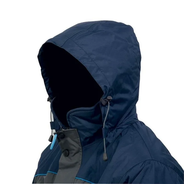 • VESTE: Fermeture frontale avec double fermeture éclair et rabat. Capuche avec visière, détachable par fermeture éclair, avec doublure intérieure isolante, réglable à l’aide de sangles. Col haut avec doublure en polaire pour une meilleure protection contre le vent et la pluie. Poignets intérieurs étanches en néoprène avec réglage par velcro à l’extérieur. Ceinture réglable. Poches chauffe-mains sur la poitrine avec fermetures à glissière. 2 poches intérieures avec fermeture éclair.