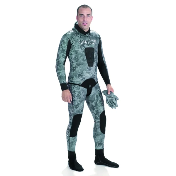Ensemble Spetton Black Diamond Camo 5mm Nouvelle combinaison chasse sous marine deux pièces (veste + salopette), réalisée en néoprène Ultraspan, intérieur refendu Cell-Plus II extérieur en jersey.