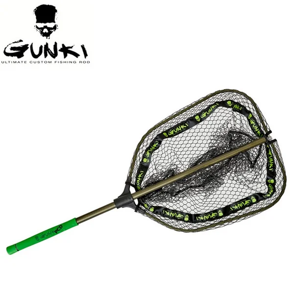 Épuisettede marque GUNKI à tête repliable, très peu encombrante, ce qui permet de la ranger facilement dans le coffre d’un bateau.