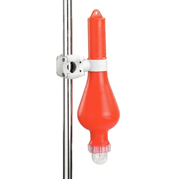 Lorsqu’on jette le feu à l’eau, la géométrie du feu fait qu’il se positionne automatiquement à la verticale. Les piles glissent alors dans le tube, et entrent en contact avec le fil qui alimente l’ampoule. Caractéristiques Feu à retournement Plastimo avec support de fixation