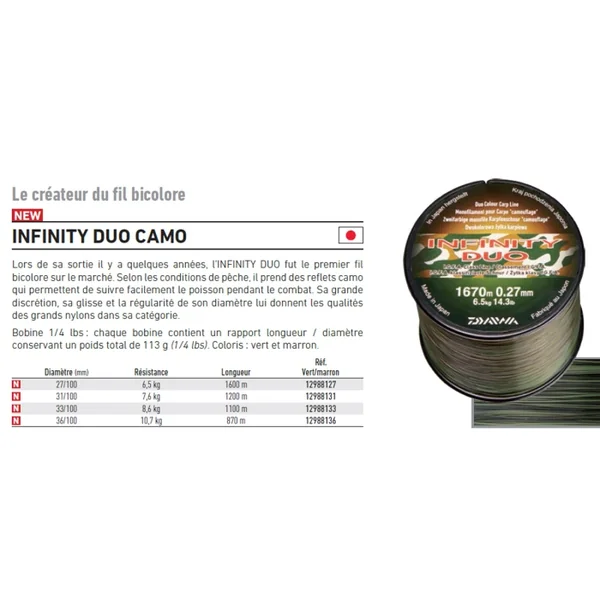 Fil Daiwa Infinity Duo Camo Carpe 1670 m 27/100 Lors de sa sortie il y a quelques années, l’INFINITY DUO fut le premier fil bicolore sur le marché. Selon les conditions de pêche, il prend des reflets camo qui permettent de suivre facilement le poisson pendant le combat. Sa grande discrétion, sa glisse et la régularité de son diamètre lui donnent les qualités des grands nylons dans sa catégorie. Bobine 1/4 lbs : chaque bobine contient un rapport longueur / diamètre conservant un poids total de 113 g (1/4 lbs). Coloris : vert et marron.