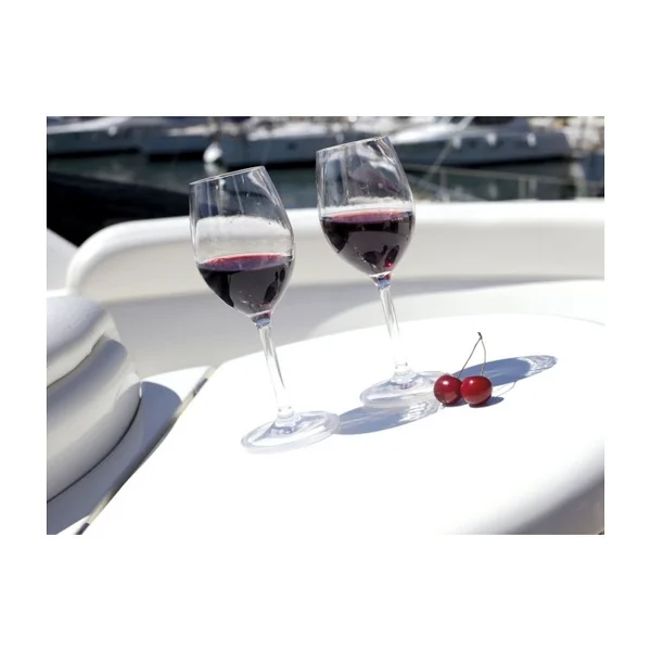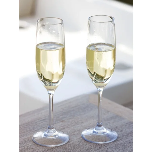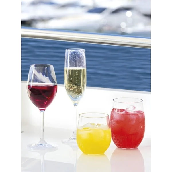 La collection de verres et flûtes antidérapantes comprend : des verres à vin, des flûtes à champagne, des verres à eau et des verres à orangeade. Le tout est coordonné au reste du service de vaisselle antidérapant en mélamine de haute qualité et à l’indiscutable style nautique.