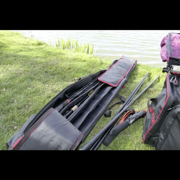 Sur un côté se trouve une poche avec des tubes intégrés pour y ranger vos scions supplémentaires. Sur l’autre côté, une poche externe dotée de fixations permet d’organiser vos piques, supports de feeder, etc.