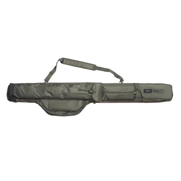 Ce fourreau carpe 3 cannes JRC Defender II est prévu pour recevoir 3 cannes de 12′, 12’6 ou 13′ et leurs moulinets montés et bien protégés dans leurs larges compartiments centraux. Il est entièrement matelassé, et peut aussi recevoir un parapluie, un shelter, des buzz bars avec leurs détecteurs montés dans ses poches latérales. Un système de sangles extérieures permet aussi de transporter un manche d’épuisette, ou une canne supplémentaire.