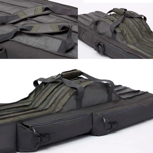 Fourreau super fonctionnel avec 2, 3 ou 4 compartiments individuels. Des deux côtés, les poches extérieures peuvent contenir un rod pod ou une épuisette. Les autres poches peuvent loger des piques et les scratch un parapluie. Le système de transport inclus une poignée standard ou le pratique “back pack system » afin d’avoir les mains libres.