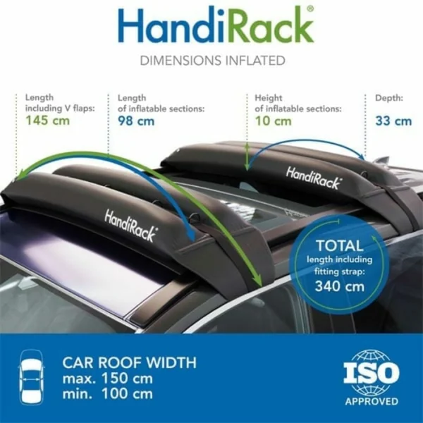 Le HandiRack est extrêmement solide et totalement sûr. Il est entièrement conforme à la norme de sécurité internationalement reconnue pour les barres de toit ISO/PAS 11154. Il est également très facile à assembler. Les sangles passent à travers les portes de la voiture et les barres se gonflent en quelques secondes grâce à la HandiPump.