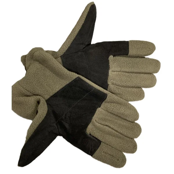 100% polyester, paume: 100% croute de cuir de porc. coloris: Kaki, taille: L au XL.