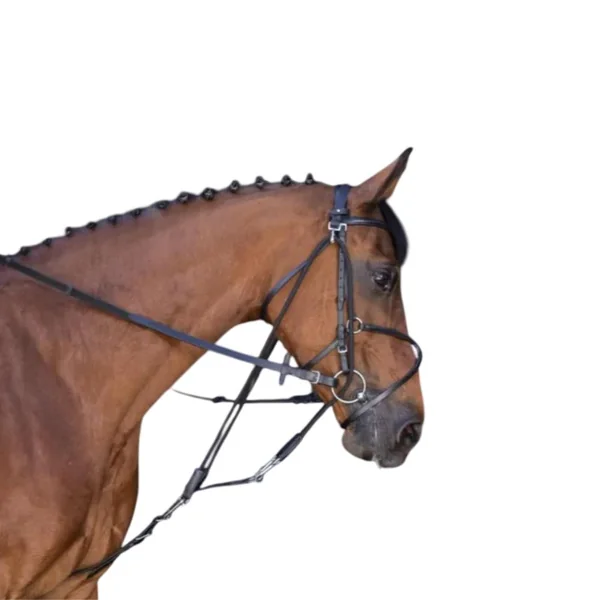 L’enrênement Gogue peut être utilisé de deux manières: En montage indépendant, en longe. En montage commandé, lorsque les extrémités des cordelettes sont reliées à une faire de rênes, en plus des rênes du filet.