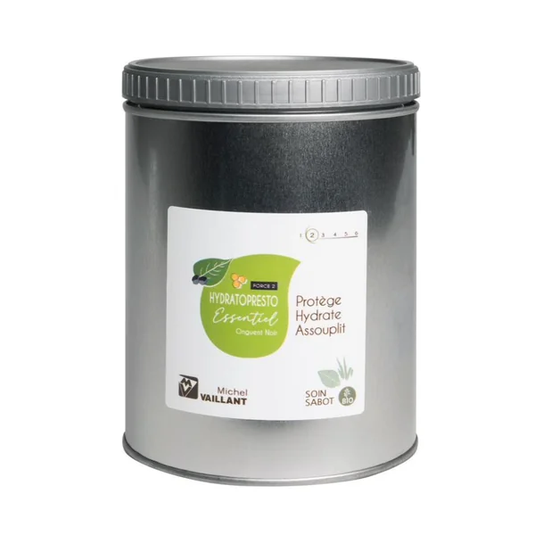 L’onguent noir HydratoPresto Essentiel Force 2 remplace en effet le soin Bio Onguent Noir Essentiel mentionné précédemment. Il offre une protection, une hydratation et une souplesse pour le sabot. Il agit à long terme comme un anti-déshydratant et purifie la fourchette tout en favorisant une pousse saine du sabot. Ce produit est formulé à partir d’un complexe d’huiles végétales conventionnelles, renforcées par des huiles essentielles et des ingrédients entièrement naturels. Il fait partie de la gamme BEE LINE qui utilise des produits de la ruche, des matières végétales naturelles reconnues pour leurs vertus anti-inflammatoires, assainissantes et cicatrisantes. Comme les autres produits mentionnés, il s’agit d’un produit d’hygiène externe adapté à une utilisation en compétition. Sa formule ne contient pas de goudron, de dérivés du pétrole ni de graisses provenant d’animaux morts. Pour l’utiliser, il est recommandé de l’appliquer quotidiennement en fonction des besoins du sabot, en n’oubliant pas les parties molles. Sa formule ultra pénétrante assure une absorption efficace.