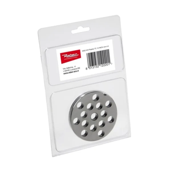 Composition : Acier inox Aisi 420. Diamètre : 4,5mm. Compatibilité : Hachoir électrique Reber n°32. Utilisation : Réalisation de pâtés fins, mousses et rillettes.