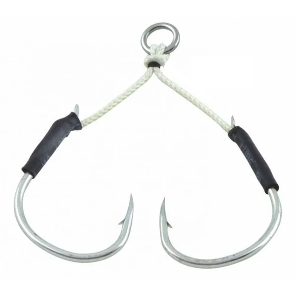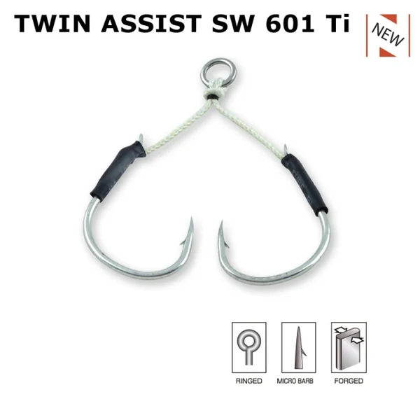 Hameçon Assist Hook Sakura Twin Assist 601 TI Ce montage double assist, est spécialement conçu pour armer vos jigs métalliques. Particulièrement adaptés aux jigs trapus type « slow jig », notre Twin Assist SW 610 Ti est très solide pour pouvoir affronter les plus gros prédateurs. les deux hameçon simples qui le constituent sont fabriqués au Japon dans un acier haute de gamme « Virgin Carbon Steel », il sont légers et très solides. Forgés pour une solidité accrue et affûtés par électrolyse, leur piquant est remarquable et leur pointe très dure résistera à l’érosion et à la déformation.