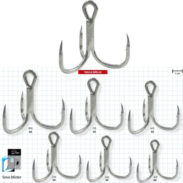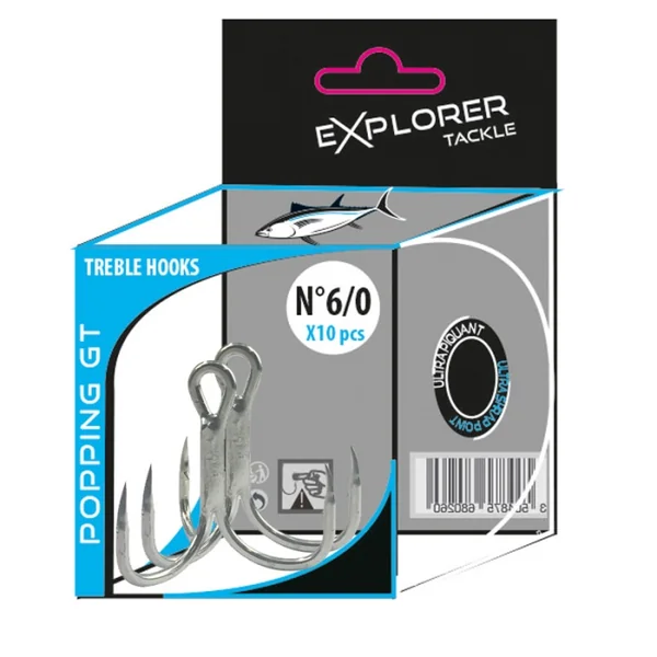 Hameçon triple Explorer Tackle Popping GT Treble Hook Hameçon triple, forgé, nickelé fort fer pour de gros poissons.