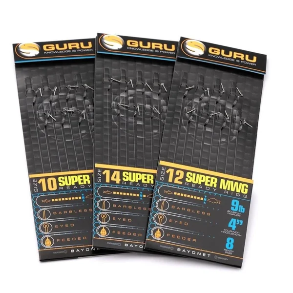 Les bas de ligne Guru Super MWG 10cm sont destinés à la pêche en carpodrome. L’hameçon Super MWG à oeillet est polyvalent, et ici monté avec un cheveu et une baïonnette.