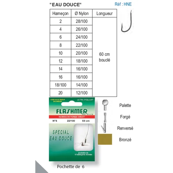 | Hameçons Montés Eau Douce X 6 | Pochette de 6 N°2 > 28/100 > 60 cm bouclé N°4 > 26/100 > 60 cm bouclé N°6 > 24/100 > 60 cm bouclé N°8 > 22/100 > 60 cm bouclé N°10 > 20/100 > 60 cm bouclé N°12 > 18/100 > 60 cm bouclé N°14 > 16/100 > 60 cm bouclé N°16 > 16/100 > 60 cm bouclé N°18 > 14/100 > 60 cm bouclé N°20 > 12/100 > 60 cm bouclé |