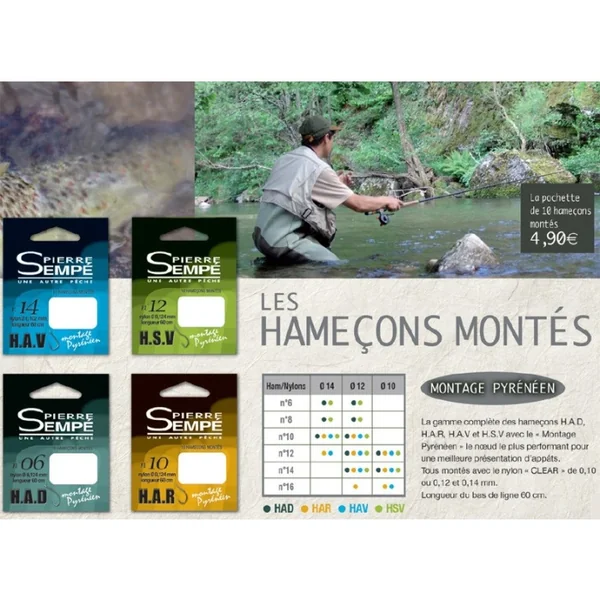 La gamme complète des hameçons HAD, HAR, HAV, HSV avec le « montage Pyrénéen » indispensable pour une meilleure présentation d’appâts.