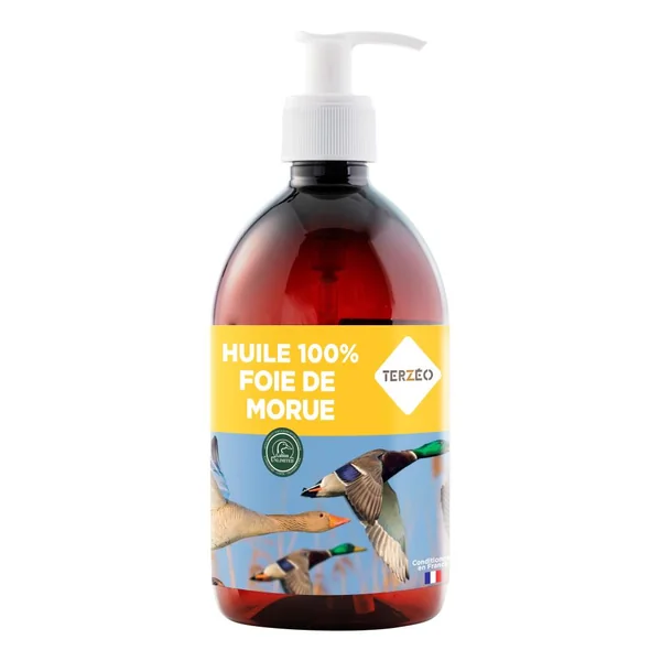 MATIERE PREMIÈRE POUR ALIMENT POUR OISEAUX L’huile 100% Foie de Morue TERZEO pour canards et sauvagine constitue un complément alimentaire indispensable. Elle contient les vitamines A et D3 qui vont soutenir la minéralisation osseuse, stimuler le système immunitaire et aider au bon fonctionnement cardiovasculaire et respiratoire. Riche en acides gras, (oméga 3 et 6), elle améliorera la qualité du plumage, sa couleur et son étanchéité.